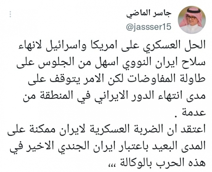 وشدد في تغريدة على حسابه بموقع التدوين المصغر تويتر، اليوم على أن: "الحل العسكري على أمريكا وإسرائيل لإنهاء سلاح إيران النووي أسهل من الجلوس على طاولة المفاوضات".