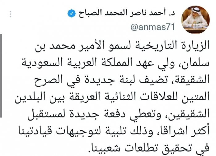 وصف الدكتور أحمد ناصر المحمد الصباح، وزير خارجية دولة الكويت، زيارة ولي العهد السعودي الأمير محمد بن سلمان، باللبنة الجديدة في صرح علاقات الدولتين الخليجيتين.