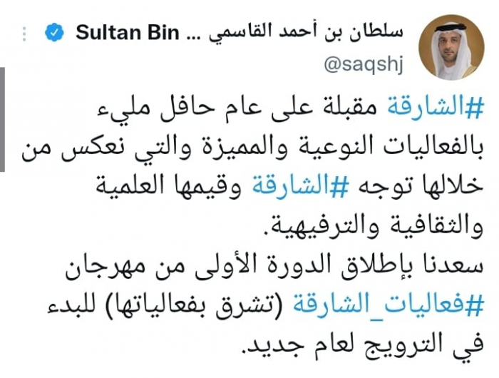 وكشف في تغريدة على حسابه بموقع التدوين المصغر تويتر، اليوم أن: "الشارقة مقبلة على عام حافل مليء بالفعاليات النوعية والمميزة".