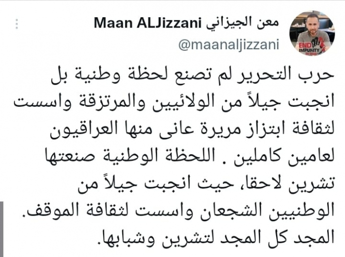 وأشار في تغريدة على حسابه بموقع التدوين المصغر تويتر، اليوم إلى أن: "حرب التحرير لم تصنع لحظة وطنية بل أنجبت جيلاً من الولائيين والمرتزقة وأسست لثقافة ابتزاز مريرة عانى منها العراقيون لعامين كاملين".