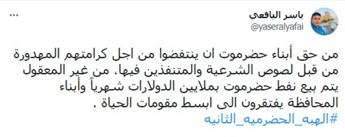 وأوضح أنه: "من غير المعقول يتم بيع نفط حضرموت بملايين الدولارات شهريًا وأبناء المحافظة يفتقرون إلى أبسط مقومات الحياة"، مثمنا: "الهبة الحضرمية الثانية".