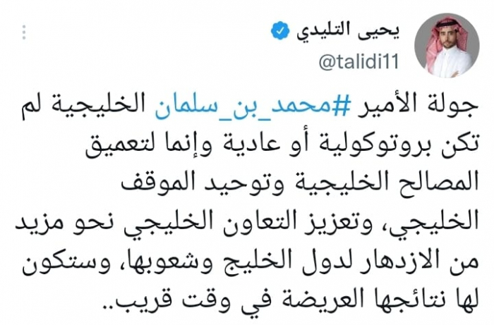 واعتبر في تغريدة على حسابه بموقع التدوين المصغر تويتر، اليوم أن: "جولة الأمير محمد بن سلمان الخليجية لم تكن بروتوكولية أو عادية".