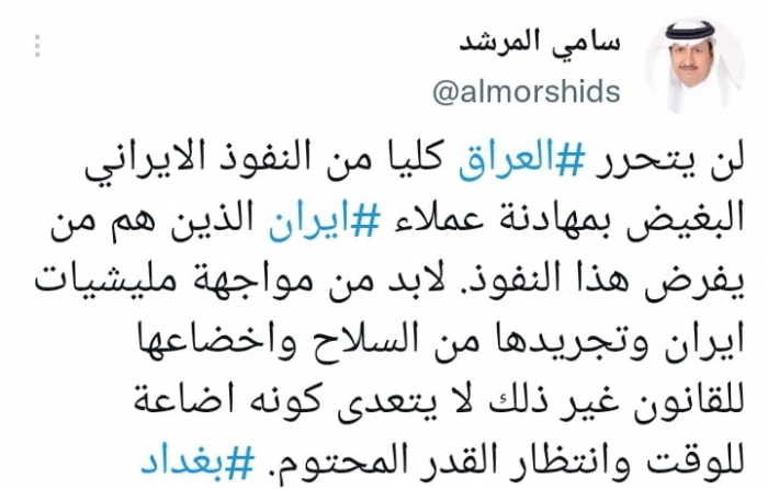 دعا المحلل السياسي سامي المرشد، بالسيطرة على المليشيات الموالية لإيران في العراق، لتحرير بغداد من هيمنة نظام ملالي طهران، محذرا من إهدار الوقت.