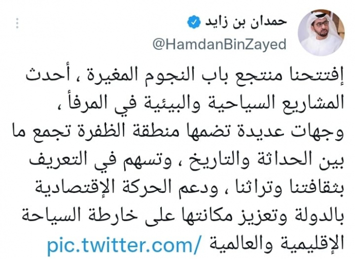 وقال في تغريدة على حسابه بموقع التدوين المصغر تويتر اليوم، إننا: "افتتحنا منتجع باب النجوم المغيرة، أحدث المشاريع السياحية والبيئية في المرفأ".