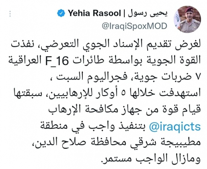 وأوضح في تغريدة على حسابه بموقع التدوين المصغر تويتر، اليوم أنه: "لغرض تقديم الإسناد الجوي التعرضي، نفذت القوة الجوية بواسطة طائرات F_16 العراقية 7 ضربات جوية، فجراليوم السبت".