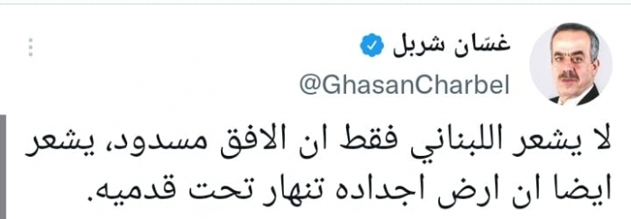 وأوضح في تغريدة على حسابه بموقع التدوين المصغر تويتر، اليوم أنه: "لا يشعر اللبناني فقط أن الأفق مسدود، يشعر أيضا أن أرض أجداده تنهار تحت قدميه".