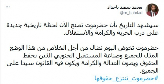 وكتب في تغريدة عبر "تويتر"، اليوم: "سيشهد التاريخ بأن حضرموت تصنع الآن لحظة تاريخية جديدة على درب الحرية والكرامة والاستقلال".