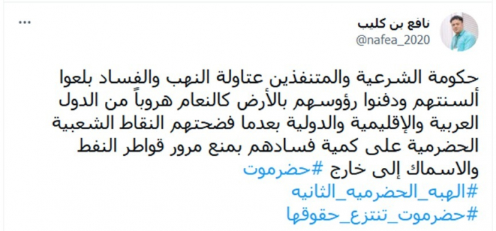 واختتم تغريدته بهاشتاجي: "الهبة الحضرمية الثانية، حضرموت تنتزع حقوقها".