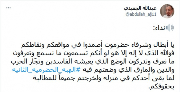 الجعيدي يوجه رسالة لشرفاء حضرموت بعد الحراك الشعبي