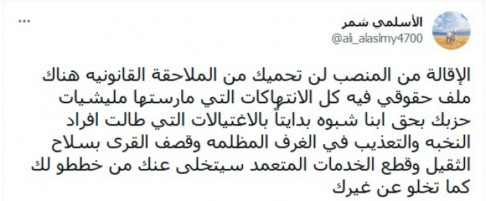 وأشار في تغريدة عبر "تويتر"، اليوم، إلى المدعو بن عديو: "الإقالة من المنصب لن تحميك من الملاحقة القانونية، هناك ملف حقوقي فيه كل الانتهاكات التي مارستها مليشيات حزبك بحق أبناء شبوة".