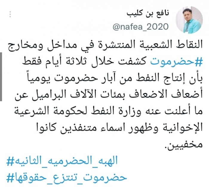 وقدرها: "بمئات الآف البراميل عن ما أعلنت عنه وزارة النفط لحكومة الشرعية الإخوانية"، مضيفا أن هناك حالات لـ: "ظهور أسماء متنفذين كانوا مخفيين"، مختتما بهاشتاج: "الهبة الحضرمية الثانية"، و"حضرموت تنتزع حقوقها".