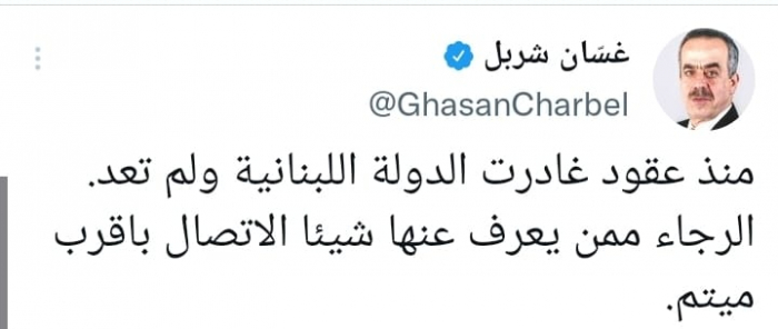 وشدد في تغريدة على حسابه بموقع التدوين المصغر تويتر، اليوم على أنه: "منذ عقود غادرت الدولة اللبنانية ولم تعد"، مضيفا: "الرجاء ممن يعرف عنها شيئا الاتصال بأقرب ميتم".