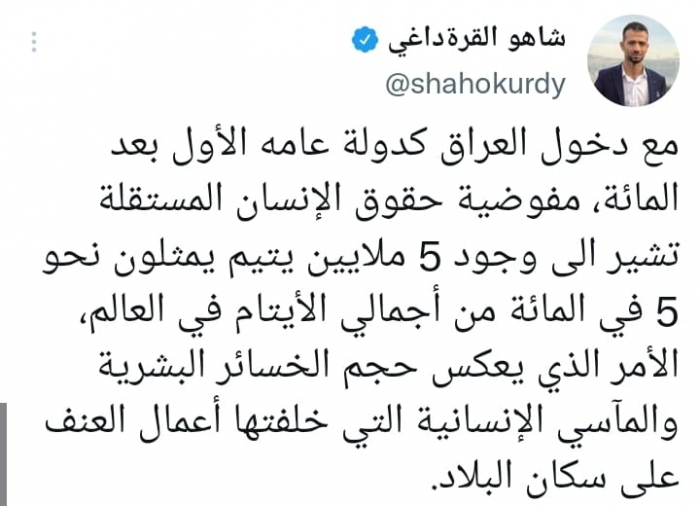 ولفت في تغريدة على حسابه بموقع التدوين المصغر تويتر، اليوم إلى أنه: "مع دخول العراق كدولة عامه الأول بعد المائة، مفوضية حقوق الإنسان المستقلة تشير إلى وجود 5 ملايين يتيم يمثلون نحو 5 في المائة من أجمالي الأيتام في العالم".