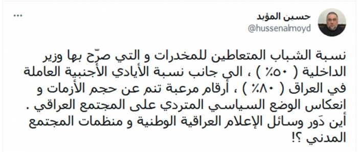 وأوضح أن: "نسبة الشباب المتعاطين للمخدرات التي صرّح بها وزير الداخلية (50%)، إلى جانب نسبة الأيادي الأجنبية العاملة في العراق (80%)، أرقام مرعبة تنم عن حجم الأزمات وانعكاس للوضع السياسي المتردي على المجتمع العراقي".