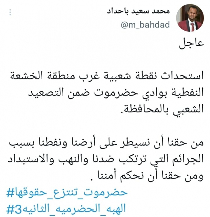 وكشف في تغريدة على حسابه بموقع التدوين المصغر تويتر، اليوم عن: "استحداث نقطة شعبية غرب منطقة الخشعة النفطية بوادي حضرموت ضمن التصعيد الشعبي بالمحافظة".