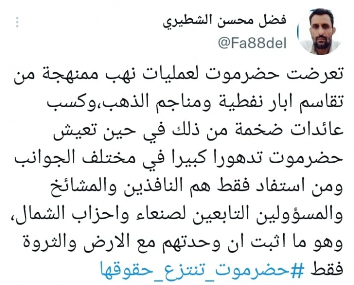 وأوضح في تغريدة على حسابه بموقع التدوين المصغر تويتر، اليوم أنه: "تعرضت حضرموت لعمليات نهب ممنهجة من تقاسم آبار نفطية ومناجم الذهب، وكسب عائدات ضخمة من ذلك".