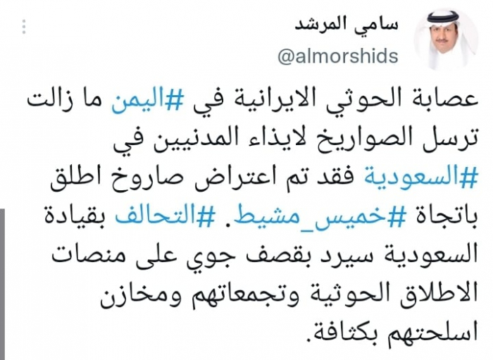 وقال في تغريدة على حسابه بموقع التدوين المصغر تويتر، اليوم إن: "عصابة الحوثي الإيرانية في اليمن ما زالت ترسل الصواريخ لإيذاء المدنيين في السعودية".