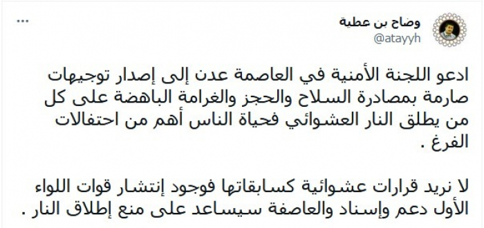 وكتب في تغريدة عبر "تويتر"، اليوم: "أدعو اللجنة الأمنية في العاصمة عدن إلى إصدار توجيهات صارمة بمصادرة السلاح والحجز والغرامة الباهظة على كل من يطلق النار العشوائي، فحياة الناس أهم من احتفالات الفرغ".