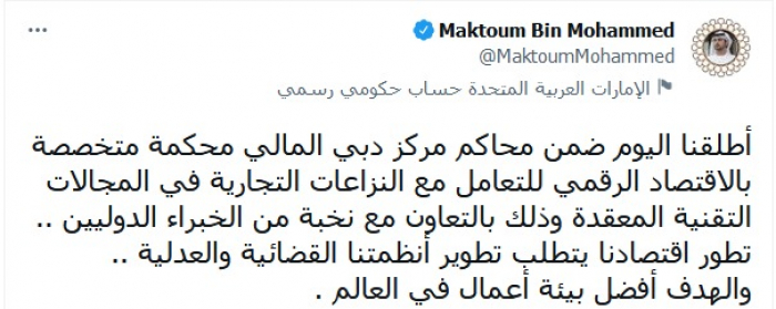 نائب حاكم دبي يطلق محكمة متخصصة بالاقتصاد الرقمي