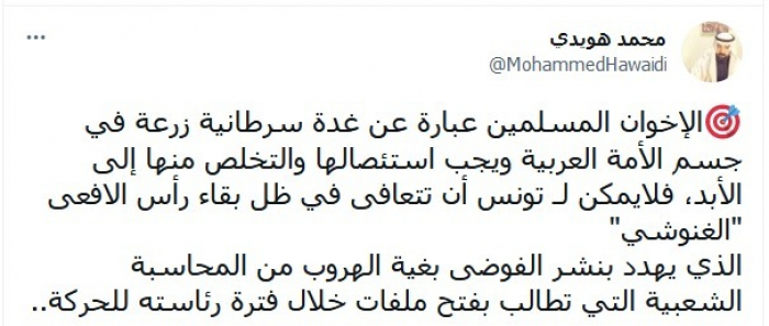 وصف المحلل السياسي السوري محمد هويدي، جماعة الإخوان الإرهابية بـ"الغدة السرطانية" التي تنهش جسد الأمة العربية، بالتزامن مع محاولات المدعو راشد الغنوسي رئيس حركة النهضة التونسية الإخوانية، الهروب من البلاد خشية الملاحقة الأمنية من تهم الفساد.
