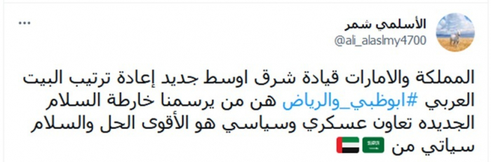 ولفت في تغريدة عبر "تويتر"، اليوم، إلى السعودية والإمارات، قائلا: "قيادة شرق أوسط جديد، إعادة ترتيب البيت العربي".