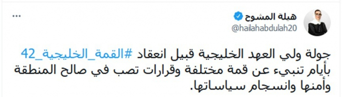 وكتبت في تغريدة عبر "تويتر"، اليوم: "جولة ولي العهد الخليجية قبيل انعقاد القمة الخليجية 42 بأيام تنبيء عن قمة مختلفة وقرارات تصب في صالح المنطقة وأمنها وانسجام سياساتها".