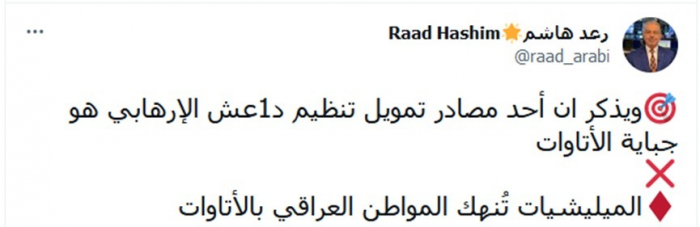 وذكر في تغريدة عبر "تويتر"، اليوم، أن: "أحد مصادر تمويل تنظيم داعش الإرهابي هو جباية الإتاوات"، مشيرا إلى أن: المليشيات تُنهك المواطن العراقي بالإتاوات".