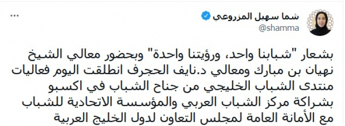 وكتبت في تغريدة عبر "تويتر"، اليوم: "بشعار (شبابنا واحد)، و(رؤيتنا واحدة)، وبحضور الشيخ نهيان بن مبارك، والدكتور نايف الحجرف، انطلقت اليوم فعاليات منتدى الشباب الخليجي من جناح الشباب في إكسبو، بشراكة مركز الشباب العربي، والمؤسسة الاتحادية للشباب مع الأمانة العامة لمجلس التعاون لدول الخليج العربية".
