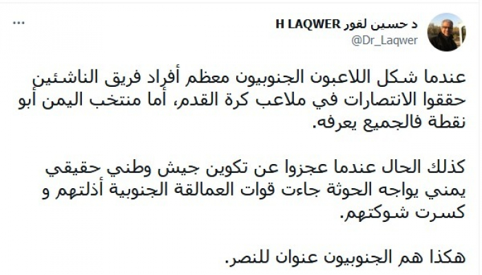 وأشار في تغريدة عبر "تويتر"، اليوم، إلى أنه: "عندما شكل اللاعبون الجنوبيون معظم أفراد فريق الناشئين حققوا الانتصارات في ملاعب كرة القدم، أما منتخب اليمن أبو نقطة فالجميع يعرفه".