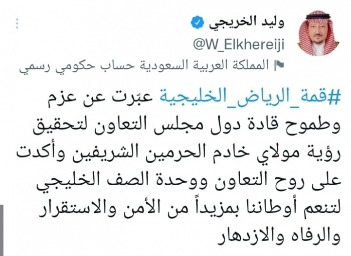 وأشار في تغريدة على حسابه بموقع التدوين المصغر تويتر، اليوم إلى أن: "قمة الرياض الخليجية عبّرت عن عزم وطموح قادة دول مجلس التعاون لتحقيق رؤية مولاي خادم الحرمين الشريفين".