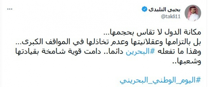 وكتب في تغريدة عبر "تويتر"، اليوم: "مكانة الدول لا تقاس بحجمها بل بالتزامها وعقلانيتها وعدم تخاذلها في المواقف الكبرى وهذا ما تفعله البحرين دائما.. دامت قوية شامخة بقيادتها وشعبها".