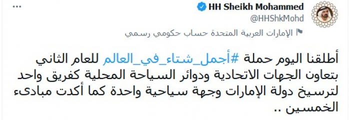 أعلن الشيخ محمد بن راشد آل مكتوم، نائب رئيس دولة الإمارات، رئيس مجلس الوزراء، حاكم دبي، إطلاق حملة أجمل شتاء في العالم، للعام الثاني.