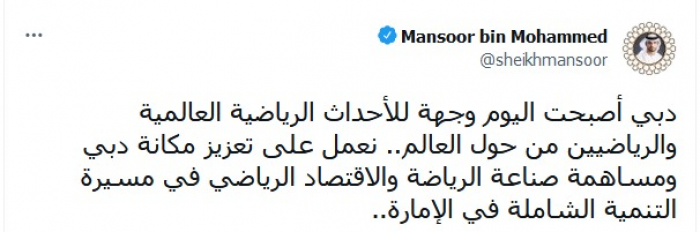 وأوضح في تغريدة عبر "تويتر": "دبي أصبحت اليوم وجهة للأحداث الرياضية العالمية والرياضيين من حول العالم".
