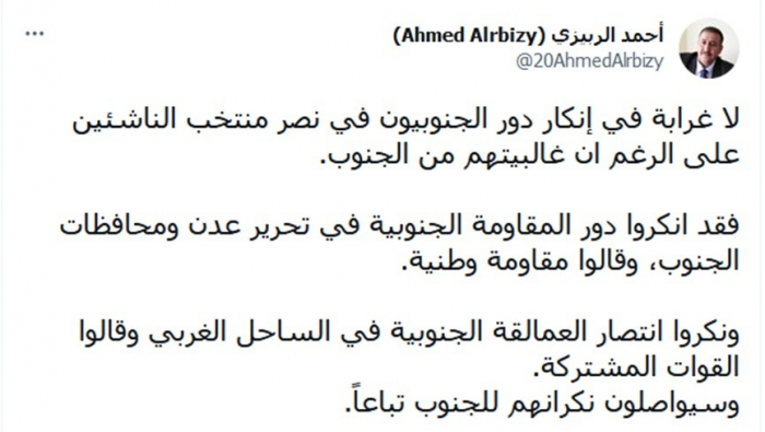 وأوضح في تغريدة عبر "تويتر"، اليوم: "لا غرابة في إنكار دور الجنوبيين في نصر منتخب الناشئين على الرغم من أن غالبيتهم من الجنوب".