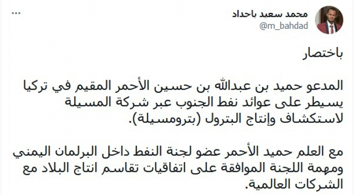 وقال في تغريدة عبر "تويتر"، اليوم: "باختصار.. المدعو حميد بن عبدالله بن حسين الأحمر المقيم في تركيا يسيطر على عوائد نفط الجنوب عبر شركة المسيلة لاستكشاف وإنتاج البترول (بترومسيلة)".