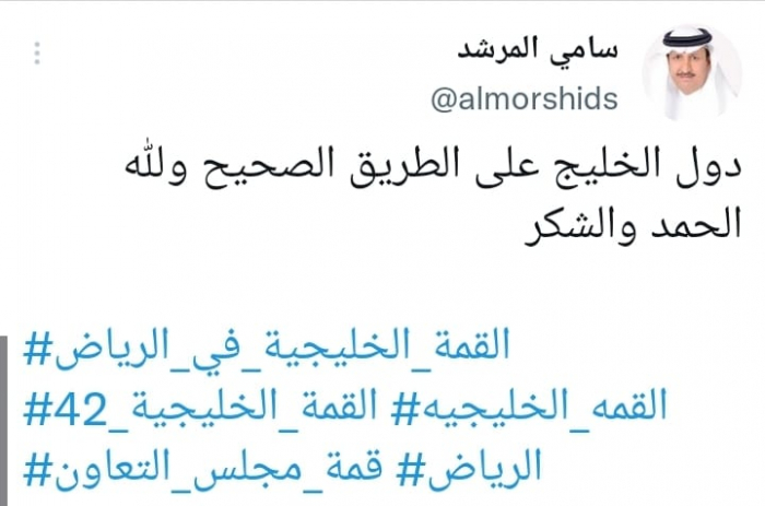 وأكد في تغريدة على حسابه بموقع التدوين المصغر تويتر، اليوم أن: "دول الخليج على الطريق الصحيح ولله الحمد والشكر"، مضيفا هاشتاج: "القمة الخليجية في الرياض والقمة الخليجية 42 والقمة الخليجية وقمة مجلس التعاون الخليجي".
