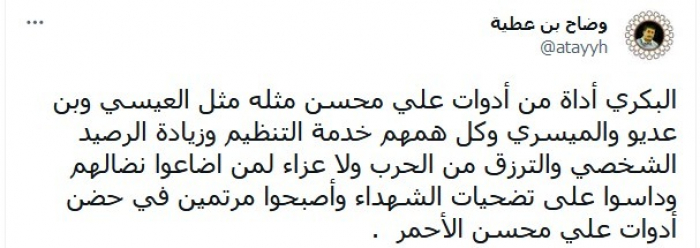 ووصف في تغريدة عبر "تويتر"، اليوم، الإخواني المدعو البكري بـ"أداة من أدوات علي محسن مثله مثل العيسي وبن عديو والميسري وكل همهم خدمة التنظيم وزيادة الرصيد الشخصي والترزق من الحرب".