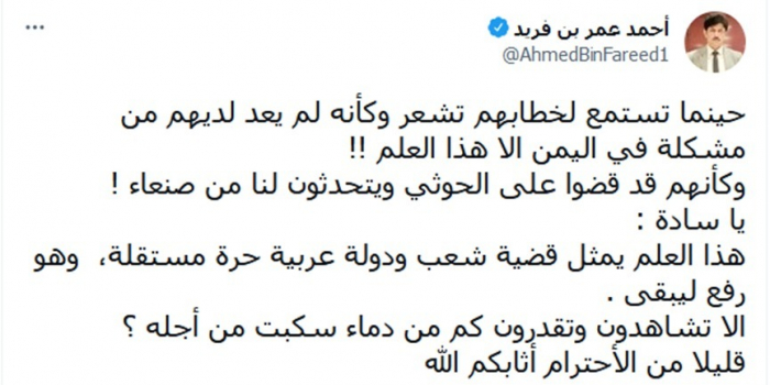 بن فريد: علم الجنوب رمز لقضية شعب ودولة عربية حرة