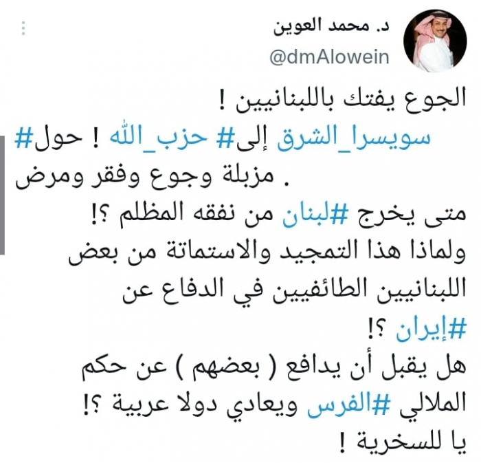 استنكر الأكاديمي والكاتب الدكتور محمد العوين، الواقع الإنساني في لبنان تحت هيمنة مليشيا حزب الله الموالية لنظام ملالي طهران، مضيفا أن اللبنانيين يعانون من الجوع والمرض.