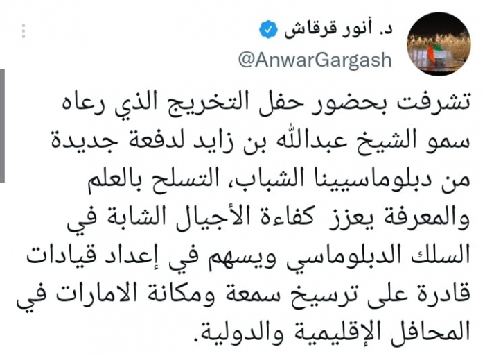 وقال في تغريدة على حسابه بموقع التدوين المصغر تويتر، اليوم إني: "تشرفت بحضور حفل التخريج الذي رعاه سمو الشيخ عبدالله بن زايد لدفعة جديدة من دبلوماسيينا الشباب".