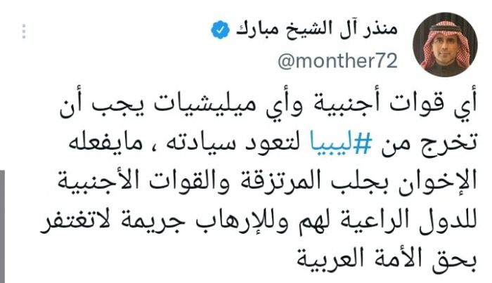 طالب المدون السعودي منذر آل الشيخ بإخراج مرتزقة تركيا والمليشيات من ليبيا لتمكينها من استعادة سيادتها.