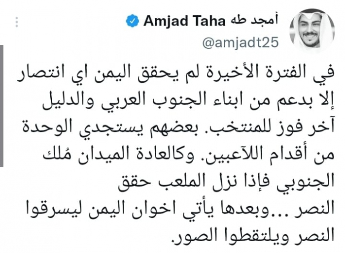 وأوضح أن: "بعضهم يستجدي الوحدة من أقدام اللاعبين، وكالعادة الميدان مُلك الجنوبي فإذا نزل الملعب حقق النصر"، متبعا: "وبعدها يأتي إخوان اليمن ليسرقوا النصر ويلتقطوا الصور".