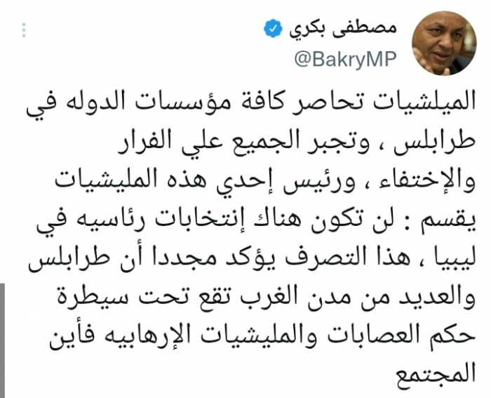 وأشار إلى أن: "رئيس إحدى هذه المليشيات يقسم: لن تكون هناك انتخابات رئاسية في ليبيا"، معتبرا أن: "هذا التصرف يؤكد مجددا أن طرابلس والعديد من مدن الغرب تقع تحت سيطرة حكم العصابات والمليشيات الإرهابية، فأين المجتمع".