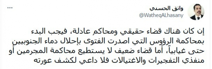 وأوضح في تغريدة عبر "تويتر"، اليوم: "إن كان هناك قضاء حقيقي ومحاكم عادلة، فيجب البدء بمحاكمة الرؤوس التي أصدرت الفتوى بإحلال دماء الجنوبيين حتى غيابيا".
