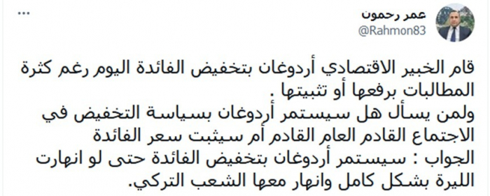 أجاب: "سيستمر أردوغان بتخفيض الفائدة حتى لو انهارت الليرة بشكل كامل وانهار معها الشعب التركي".