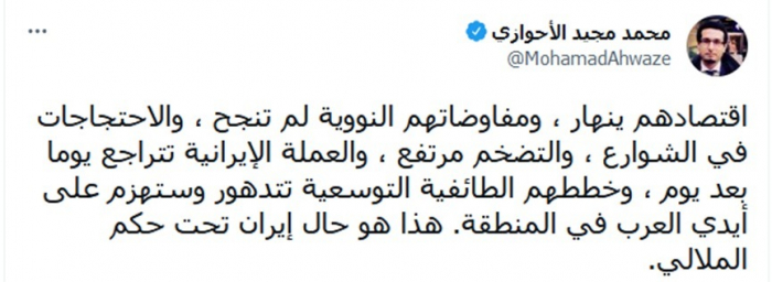 واختتم تغريدته: "هذا هو حال إيران تحت حكم الملالي".