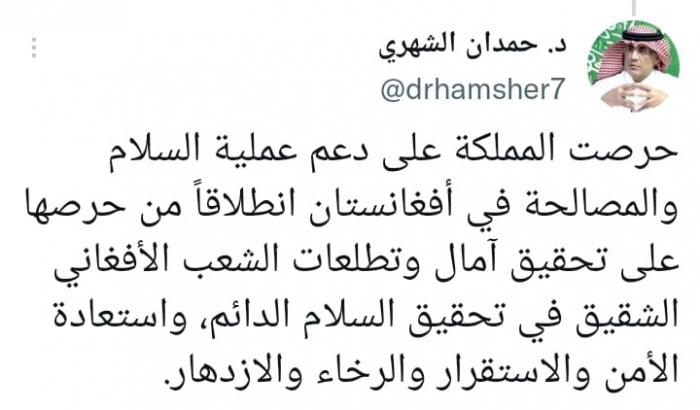 شدد الباحث السياسي الدكتور حمدان الشهري على اهتمام المملكة العربية السعودية بتحقيق السلام وفي أفغانستان حرصا على الشعب الأفغاني ومستقبله وتطلعاته وحقه في الأمن.