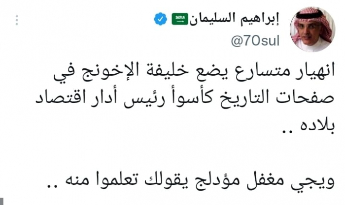 وقال في تغريدة على حسابه بموقع التدوين المصغر تويتر، اليوم إنه: "انهيار متسارع يضع خليفة الإخونج في صفحات التاريخ كأسوأ رئيس أدار اقتصاد بلاده، ويجي مغفل مؤدلج يقولك تعلموا منه".