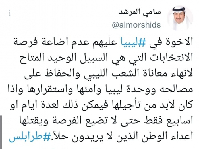 ورأى أنه: "إذا كان لابد من تأجيلها فيمكن ذلك لعدة أيام أو أسابيع فقط حتى لا تضيع الفرصة ويقتلها أعداء الوطن الذين لا يريدون حلاً"، مختتما بهاشتاج: "طرابلس".