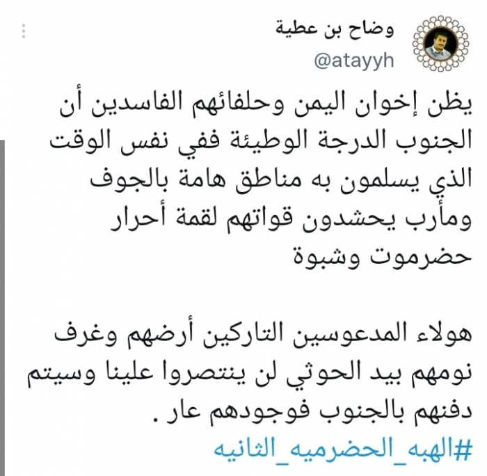 توعد وضاح بن عطية عضو الجمعية الوطنية الشرعية الإخوانية ومليشياتها بالهزيمة في الجنوب، بعد حشدها المليشيات لمواجهة المواطنين في حضرموت.
